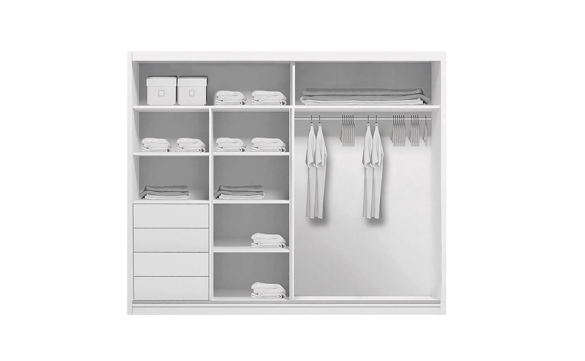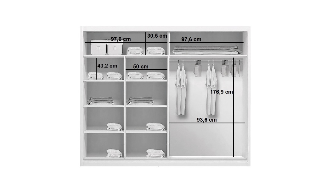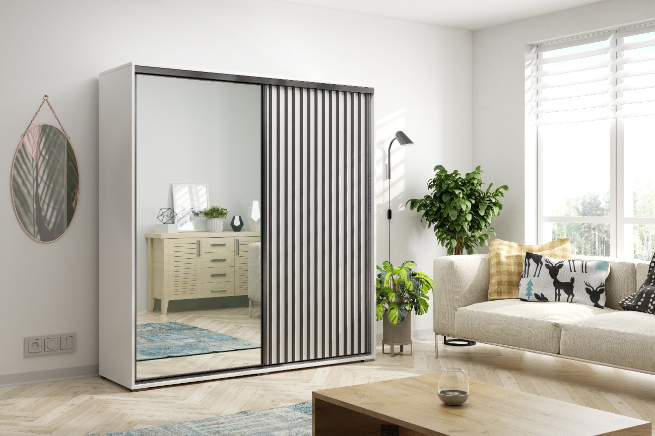 Szafa jest wykonana z płyty laminowanej o grubości 16 mm w kolorze białym. Na jednych drzwiach przyklejone jest lustro na drugich czarne lamele. W garderobie został zastosowany system drzwi przesuwnych w kolorze czarnym. Wyposażona jest w stalowe prowadnice, dolne wózki na łożyskach a dodatkowo w drzwiach zastosowano stalowe czarne rączki ułatwiające użytkowanie oraz zapobiegają wyprężaniu się drzwi.